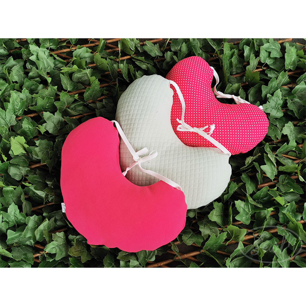 De hartvorm maakt dat het kussen goed in de oksel past, omdat het kussen op de schouder met linten vastgeknoopt word past hij altijd en blijft zelf op zijn plek zitten.